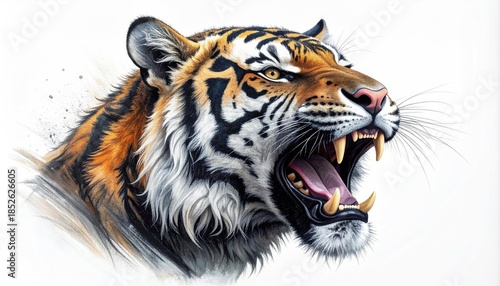 Fierce Bengal tiger portrait with open mouth baring teeth