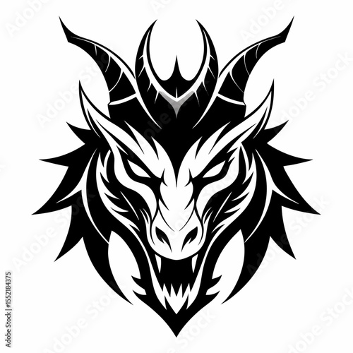 Fierce black dragon head with sharp horns and teeth in tribal style