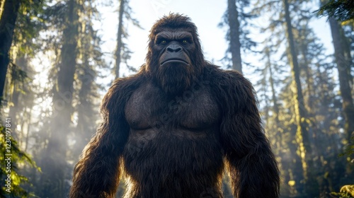 Fierce Creature Stands in Forest Surrounded by Tall Trees and Light