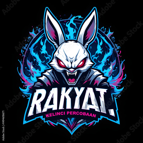 Fierce white rabbit mascot with glowing red eyes and fiery blue aura. Features bold “RAKYAT” text and “Kelinci Percobaan” tagline. Ideal for eSports, gaming logos, or edgy team branding.