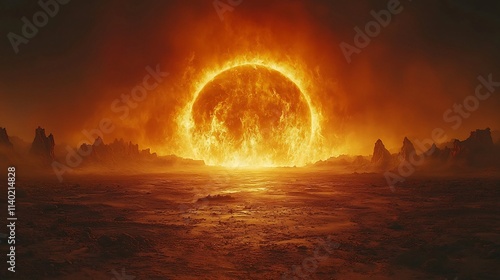 Fiery Desert Sun Rising Over Glowing Landscape Intense Natural Sunlight Concept