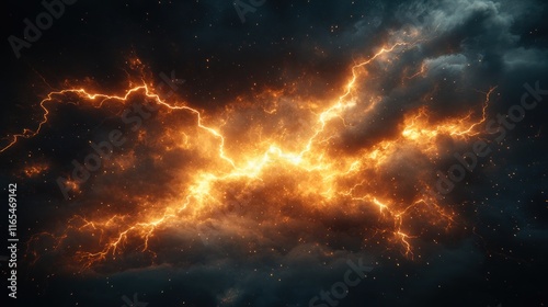 Fiery orange lightning bolt in dark clouds.