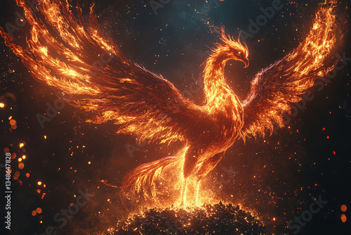 Fiery phoenix rising from the ashes in a blaze of flames and sparks