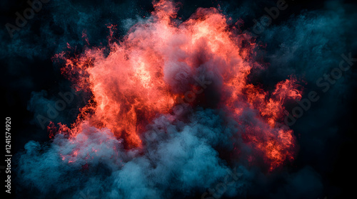 Fiery red and blue smoke explosion against black background; ideal for dramatic visuals