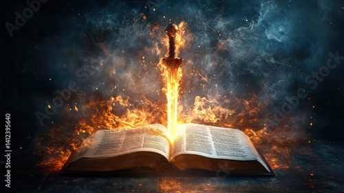 Fiery sword emanating power from an ancient tome in dramatic fashion