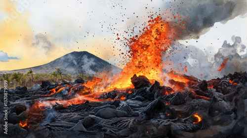 fiery volcanic eruption with molten lava spewing into air, surrounded by glowing lava fields and smoke clouds, with distant mountain and palm trees in background
