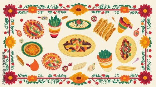 Fiesta Time: Vibrant Mexican Food and Decorative Patterns with Marigold Border
