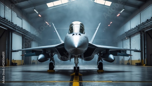 Fighter jet aircraft positioned in an undisclosed hangar with a front view rendering.