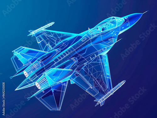 Fighter jet visualization with augmented reality Transparent fighter jet in studio drawing in blue colors