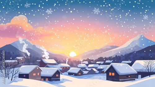 雪山の見える雪原の村と綺麗な夕焼けの雪の降るイラスト