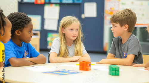 小学校の教室で座って相談する子どもたち 話し合い チーム