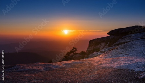 높은 절벽 위에 반짝이는 새벽녘의 태양, 어두운 하늘이 점차 물드는 장면