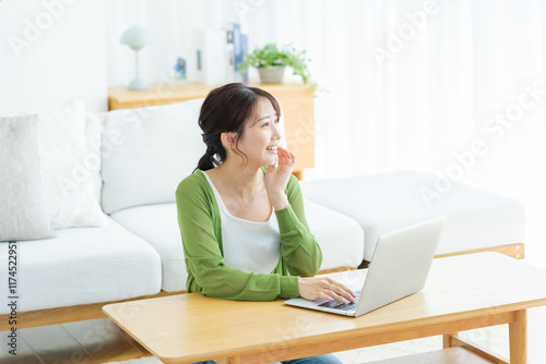 自宅でノートパソコンを操作する若い女性