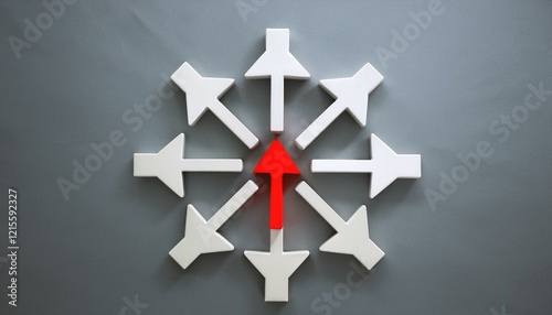 구조적으로 연결된 화살표들이 대칭을 이루는 네트워크에서, 중심에 있는 하나의 요소만 붉은빛으로 강조된 장면