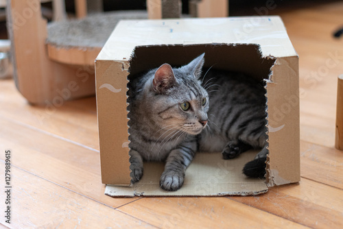 ダンボール箱の中でくつろぐ可愛い猫 サバトラ猫