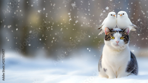 シマエナガと日本猫の可愛い画像
