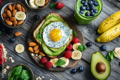 栄養満点のアボカドトーストとフルーツのヘルシーフード写真