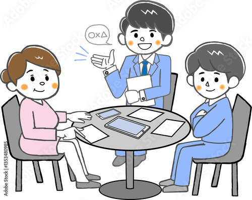 営業マンによる商品説明を聞く若い男女の顧客