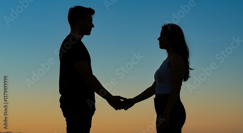 夕焼け空の下、静かに手をつなぐ恋人シルエット。優しい光が二人を包む