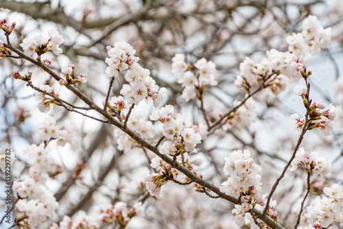 満開の桜の枝と背景の花々