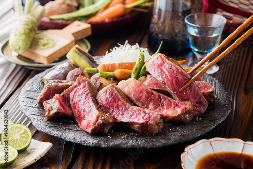 【和牛サーロインステーキ】 和牛サーロインを焼き目香ばしく赤身は残したレアに仕上げました。