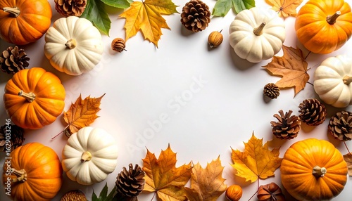 かぼちゃと松ぼっくり、落ち葉が囲む紙の質感を生かした中央の空白スペースが季節のメッセージにぴったりの秋のフレームデザイン