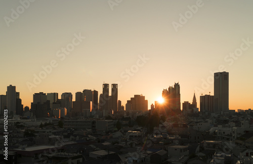 東京風景 新宿高層ビル群 日の出 太陽光線