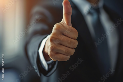 スーツ姿の日本人ビジネスマンが親指を立てる手元アップ