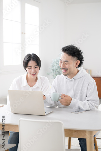 綺麗なリビングでダイニングパソコンを見ながら話す夫婦 幸せな結婚のイメージ