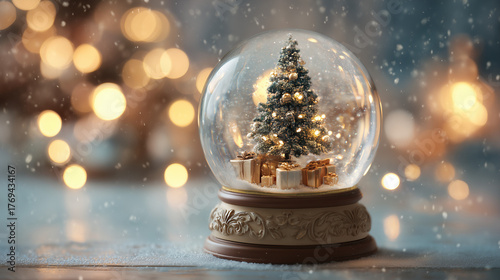 クリスマスツリーとプレゼントが入った、美しいスノードームの写真