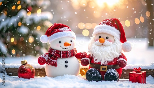かわいいサンタクロースとスノーマンのぬいぐるみ 雪景色