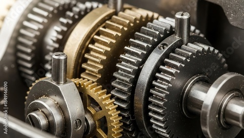 精密な機械部品、歯車が織りなす複雑な構造美。金属の質感とアンティーク調の色彩がインダストリアルな魅力を引き立てる。