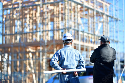住宅建築の建て主と打ち合わせする工事監督