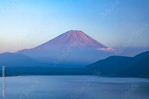 夕焼けで赤く染まった富士山、山梨県富士河口湖町本栖湖にて
