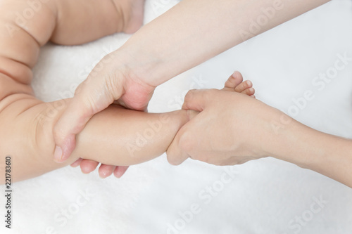 新生児の沐浴後の保湿方法を説明するマニュアル用写真。足に保湿剤を両手の手の平でマッサージしながら塗るクローズアップ