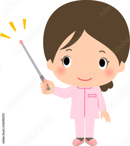 指示棒を持つピンクの制服を着た若い女性