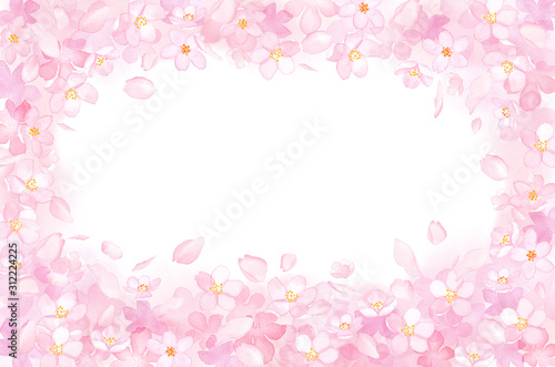 春の花:さくらと散る花びらの囲みフレーム 水彩イラスト