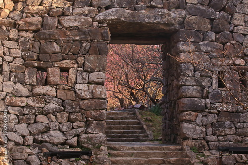 城門の中に見えたピンクの桜