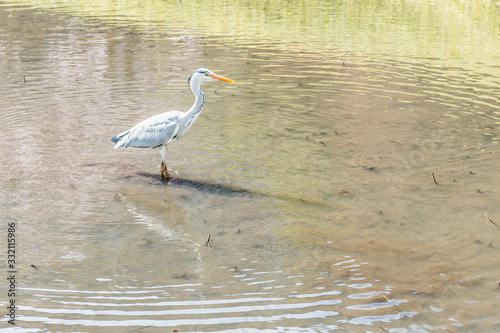 東京都文京区後楽園の公園の池をゆっくり歩くアオサギ