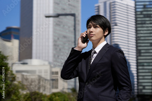 オフィス街で電話をする日本人男性ビジネスマン