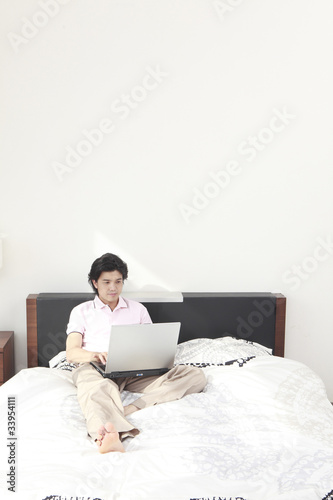 ベッドの上でノートパソコンに向かう男性
