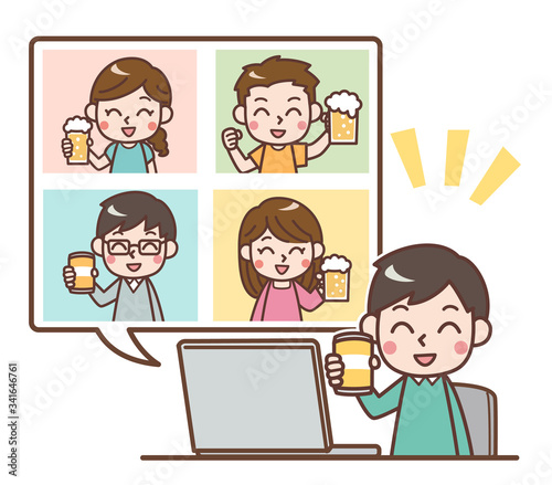 オンライン飲み会 ビールで乾杯する男女