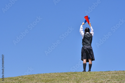 青空で応援する女の子(後姿)