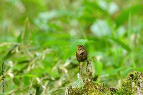 苔むした倒木の上で大きな声でさえずるミソサザイ