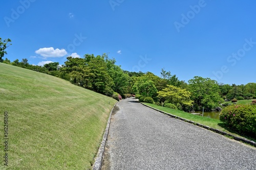 青空と新緑に包まれた日本庭園の遊歩道の情景@大阪