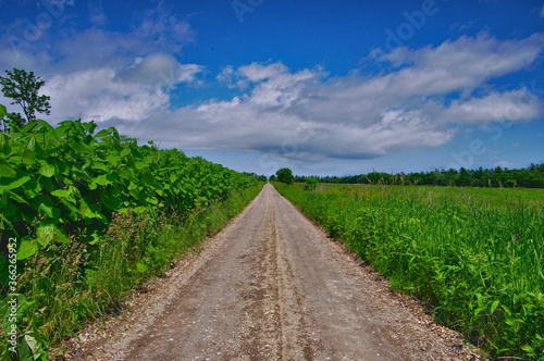 青空の下、畑の中を真っ直ぐ進む道。北海道、日本。