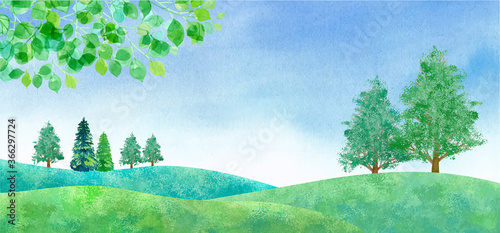 新緑と青空の平原の風景、水彩イラスト(トレースベクター)。レイアウト変更可能。
