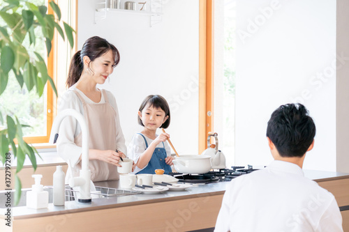 キッチンで料理する家族・ファミリー