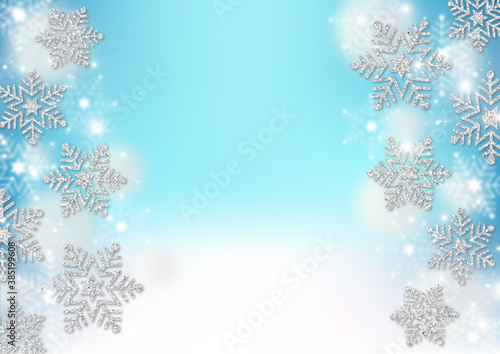 銀色のラメの雪の結晶と綿雪 水色のグラデーション背景 ふわふわの白のドット 冬のフレーム素材