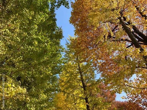 紅葉するイチョウの木,緑から黄色へのグラデーション,日本の秋
